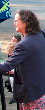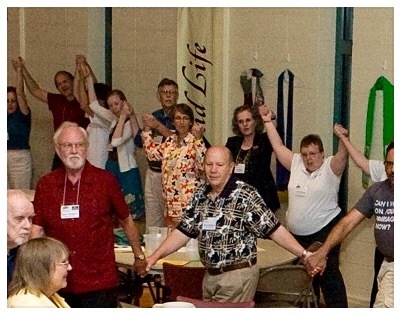 A word about the photos. The first photo shows a button Pam regularly wore at meetings of the Presbyterian Church (U.S.A.) General Assembly. Tricia posted it on Facebook. The second photo shows Tricia (in the flowered jacket under the banner) and Pam (to her right in the photo) among friends and colleagues as is only fitting. It comes from Ray Bagnuolo.